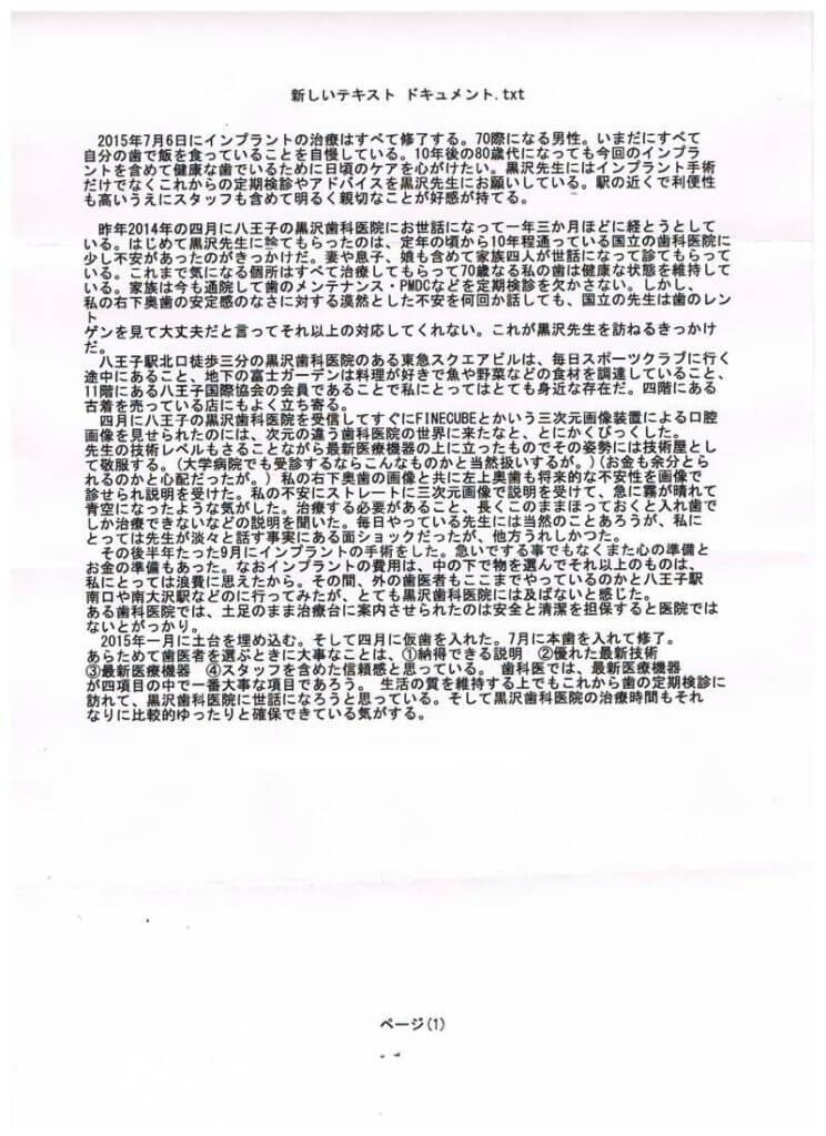 2015年7月6日にインプラントの治療はすべて修了する。70際になる男性。いまだにすべて自分の歯で飯を食っていることを自慢している。10年後の80歳代になっても今回のインプラントを含めて健康な歯でいるために日頃のケアを心がけたい。黒沢先生にはインプラント手術だけでなくこれからの定期検診やアドバイスを黒沢先生にお願いしている。駅近くで利便性も高いうえにスタッフも含めて明るく親切なことが好感が持てる。